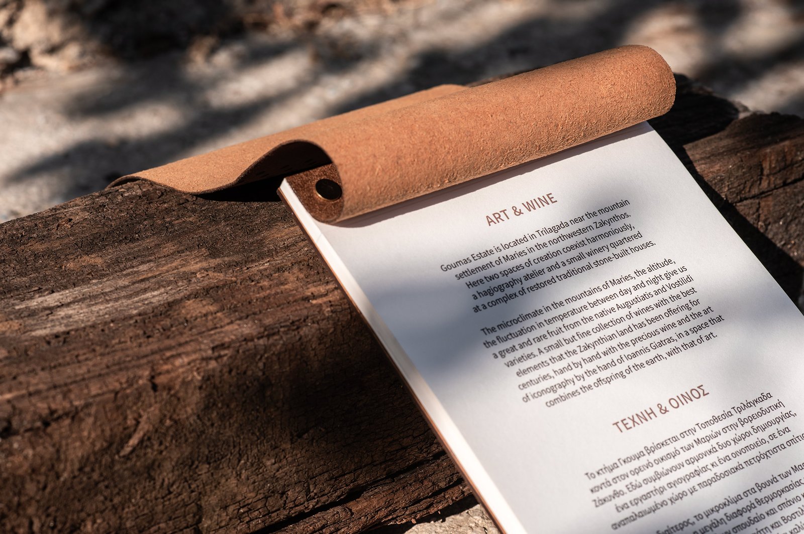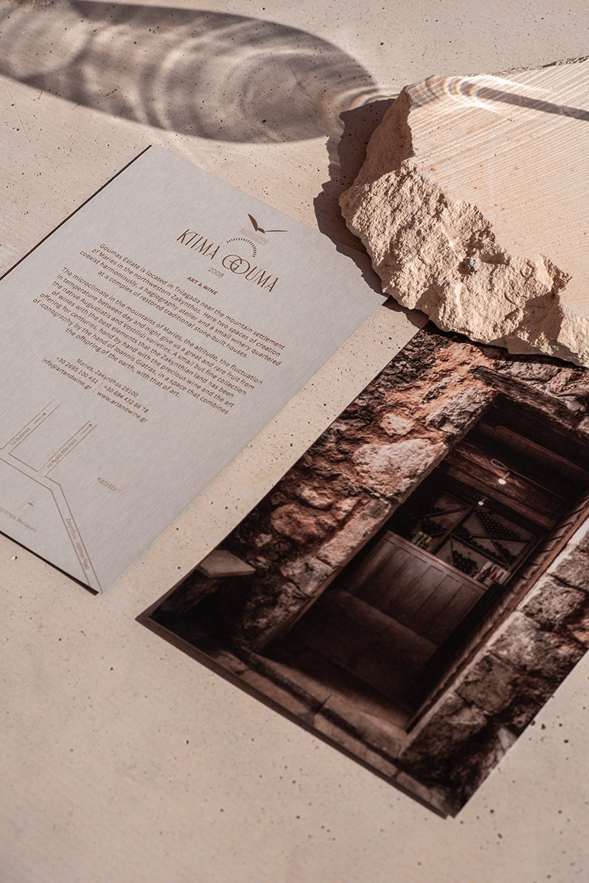 Ktima Gouma (Goumas Estate) is a traditional winery in Trilagada, a semi-mountainous location near Maries Village in Zakynthos. The family-run winery produces select wines from time-honored native varieties. The people at Ktima Gouma trusted me to design their business's new visual identity to match their products’ refined, connoisseur-grade quality. For the rebranding, I drew inspiration from the location's geomorphology, the restored centuries-old premises' look and feel, and the winemaker's other passion, religious iconography. The new logotype consists of three symbols arranged vertically. At the top are the three dales (lagadia), after which the winery's location takes its name (Tri-lagada). The middle symbol represents the Goumas vineyards. Right below, are the estate's arched gates. The symbols’ vertical arrangement references the Byzantine script used in Orthodox iconography, a nod to the owner's artistic work. Underneath, the winery’s brand name is set in an elegant typeface (Musetta Regular by atipo foundry) with long and narrow elements that aesthetically match that vertical set-up. Finally, the brand colors were inspired by construction elements found across the estate: stone, wood, soil, and the conspicuous pink stucco adorning the winery's walls, which is made with crimson iconography paint.