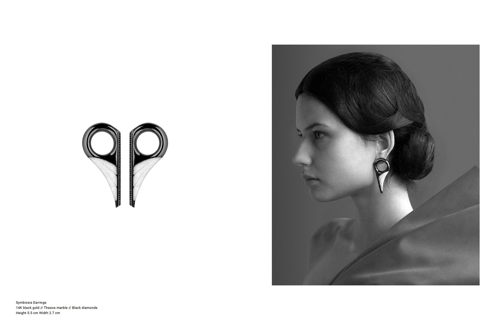 The Look Book ‘Symbiosis’ is the first fine jewelry collection of designers’s Ioanna Souflia, introducing a modern take on luxury. Inspired by the designer’s black and white cosmos where Thasos marble and gold, embellished with grey and black diamonds, playfully co-exist into fashion-forward pieces that stimulate the senses.