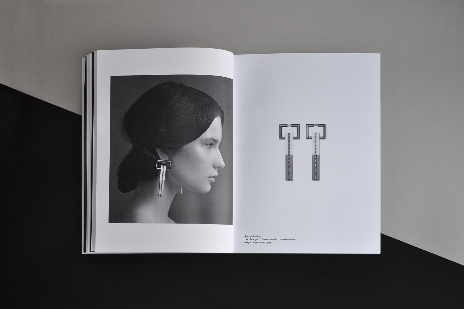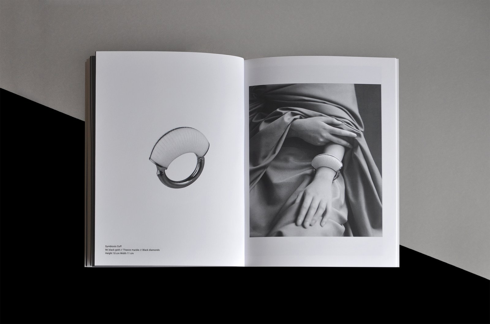 The look book presents the precious jewelries as sculptural pieces which stand in the central point creating dialogues with the photographs and co-exist in a symbiotic relationship. The contrast of black and white flows inside the pages with minimal forms and different sizes creating a harmonic final result which engages the whole collection and reflects the brand’s aesthetic and the designer’s vision of precious jewelry.
