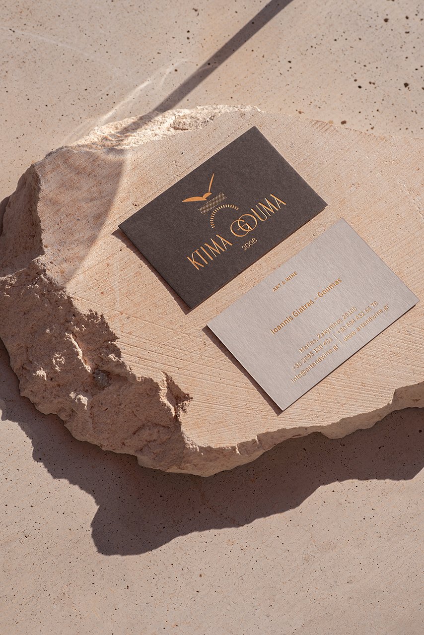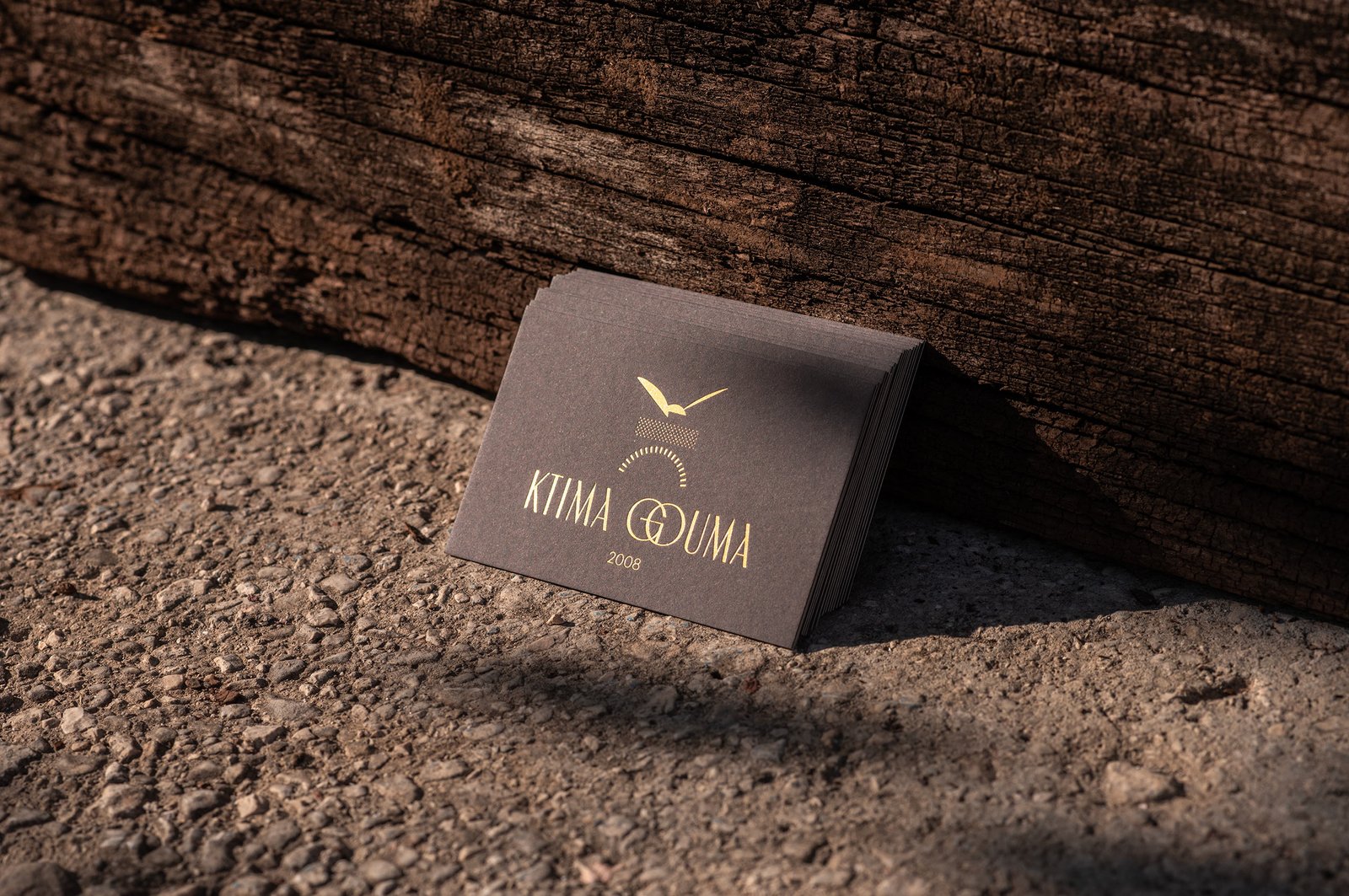 Ktima Gouma (Goumas Estate) is a traditional winery in Trilagada, a semi-mountainous location near Maries Village in Zakynthos. The family-run winery produces select wines from time-honored native varieties. The people at Ktima Gouma trusted me to design their business's new visual identity to match their products’ refined, connoisseur-grade quality. For the rebranding, I drew inspiration from the location's geomorphology, the restored centuries-old premises' look and feel, and the winemaker's other passion, religious iconography. The new logotype consists of three symbols arranged vertically. At the top are the three dales (lagadia), after which the winery's location takes its name (Tri-lagada). The middle symbol represents the Goumas vineyards. Right below, are the estate's arched gates. The symbols’ vertical arrangement references the Byzantine script used in Orthodox iconography, a nod to the owner's artistic work. Underneath, the winery’s brand name is set in an elegant typeface (Musetta Regular by atipo foundry) with long and narrow elements that aesthetically match that vertical set-up. Finally, the brand colors were inspired by construction elements found across the estate: stone, wood, soil, and the conspicuous pink stucco adorning the winery's walls, which is made with crimson iconography paint.